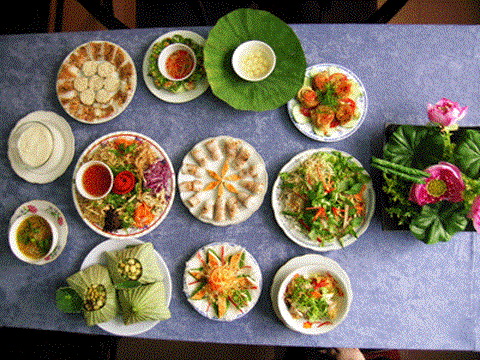In Hue gibt es vegane und vegetarische Gerichte und Spezialitäten nicht nur für die Bewohner, sondern auch für Touristen. Die veganen Restaurants in Hue bieten vegane Gerichte auf Bestellung der Kunden an. Der Partytisch besteht aus Speisen wie vietnamesische Würsten, Hühnerkeulen und Fischen, die aus verschiedenen Knollen, Früchten, Bohnen und Pflanzenöl gekocht werden. Nguyen Khoa Tuyet aus dem Kreis Phong Dien freut sich auf vegane Gerichte.