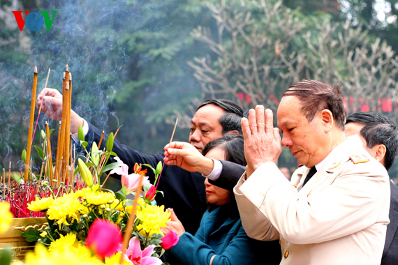 | Vertreter der Hanoier Behörden zünden Räucherstäbchen zum Ehren von König Quang Trung an. |