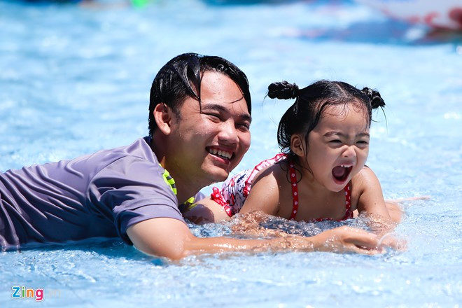 | Thanh und seine Ehefrau arbeiten meistens rund um die Uhr. Sie spenden jedoch ihre Freizeit immer für ihre Zwillinge Xuan An und Khanh An, heute im Wasserpark. |