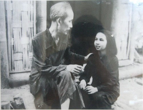| Ho Chi Minh sprach mit Nguyen Thi Thanh, einer ausgezeichneten Mitarbeiterin der Branche zur Papier-Herstellung im Mai 1952. |