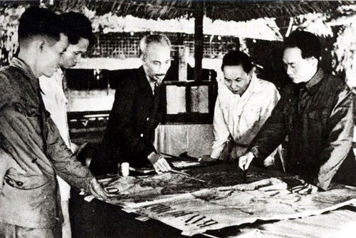 | Präsident Ho Chi Minh und General Vo Nguyen Giap diskutierten den Kampfplan im Vorfeld der Dien-Bien-Phu-Offensive im Jahr 1954. |