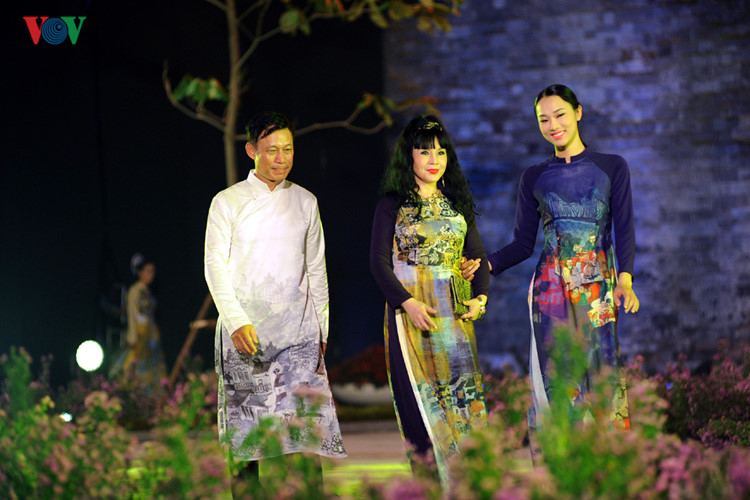 | Die ausgezeichnete Künstlerin Chieu Xuan (2.v.r) und die Vertreterin der Weltgesundheitsorganisation, Tuija Bercovici, nehmen an der Ao Dai-Show der Designerin Lan Huong teil. |