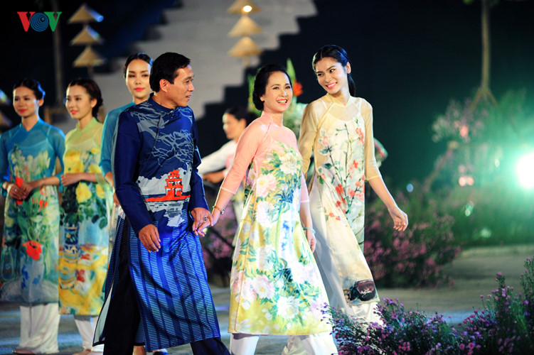 | Bei der Eröffnungsfeier des Ao Dai-Festivals Hanoi 2016 sind Zuschauer überrascht über eine beeindruckende Vorführung von besonderen Models. Die Models sind schöne und berühmte vietnamesische Schauspieler und Schauspielerinnen. Auf dem Foto sieht man die ausgezeichnete Künstlerin Lan Huong (Mitte) und den ausgezeichneten Künstler Tien Hoi, die einen Ao Dai des Designers Quang Huy tragen. |