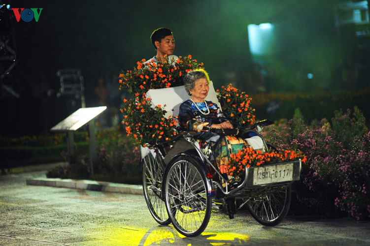 | Besonders beeindruckend ist die Teilnahme der 90-jährigen Ehefrau des verstorbenen Malers Bui Xuan Phai, Nguyen Thi Sinh, an der Ao Dai-Show. |
