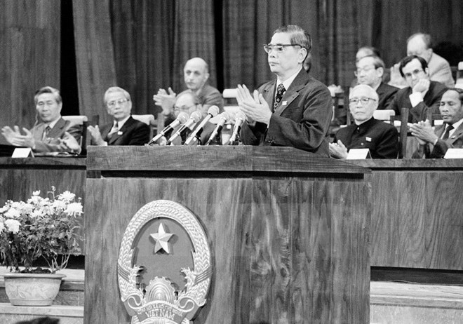 | KPV-Generalsekretär Nguyen Van Linh Ende 1986 bei seiner Abschlussrede auf dem 6. Parteitag in Hanoi. (Foto: Minh Dao/ vietnamplus.vn) |