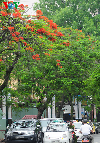 | Die roten Blüten der Flammenbäume mitten in der Hauptstadt Hanoi. |