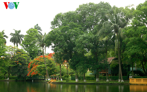 | Die roten Blüten der Flammenbäume neben dem Stelzenhaus von Präsident Ho Chi Minh in der Gedenkstätte des Präsidentenpalastes. |