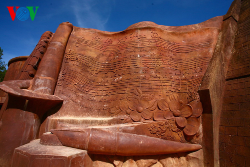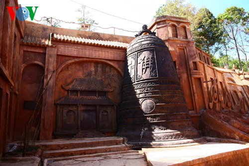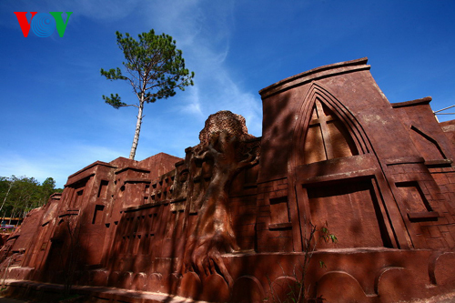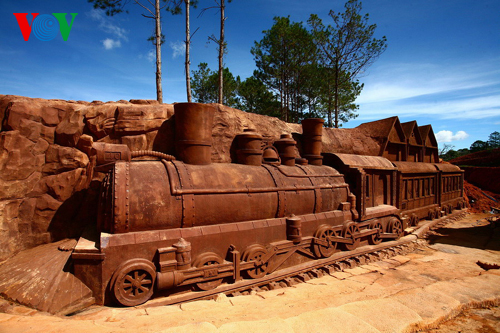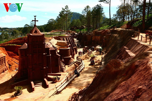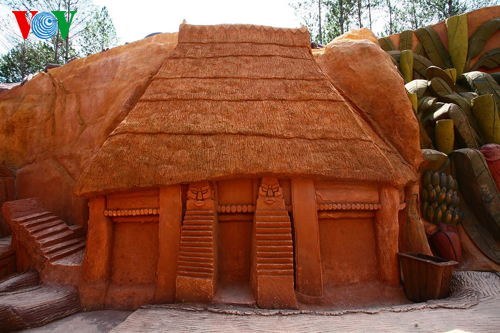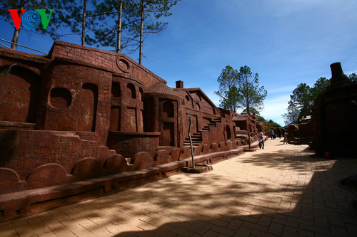 “Der Tunnel der Bildhauerei” wird aus dem roten Lehm des Hochlands und einigen anderen Baumaterialen gebaut Die Zusammensetzung ergibt einen natürlichen und starken Baustoff in der typisch roten Farbe des Bodens. Der Plan zum Bau dieser Einrichtung wurde seit 2008 ausgearbeitet. Nach vielen Versuchen ist es dem Inhaber des Tourismusgebiets Trinh Ba Dung gelungen, das beste Baumaterial für die Errichtung des großartigen Bildhauerwerks zu finden. Das Werk ist das Ergebnis der Arbeit von mehr als 100 Malern, Bildhauern und Maurern.