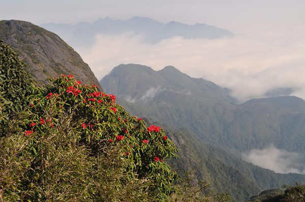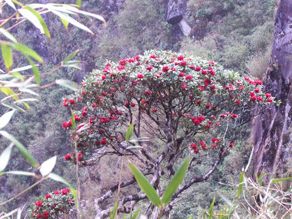 | Rhododendren blühen in der Höhe von 3000 Meter auf dem Weg zum Berggipfel Fan Xi Pang. |