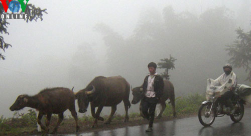 | Wegen des dichten Nebels müssen die Auto ihre Scheinwerfer auf dem Gebirgspass O-Quy-Ho anschalten. |