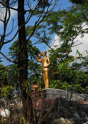 | Beim Eintritt in die Stadt Ha Giang sehen wir den Grenzstein Nummer 0, der sich neben dem Hauptplatz der Stadt befindet. Hier steht die Statue des Präsidenten Ho Chi Minh mit den Volksgruppen. |