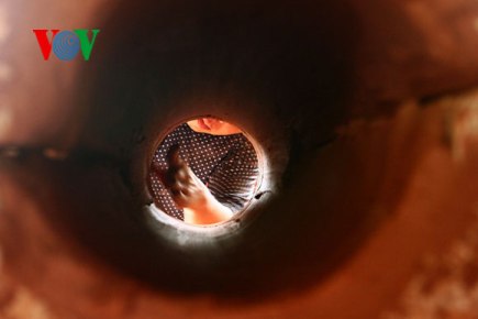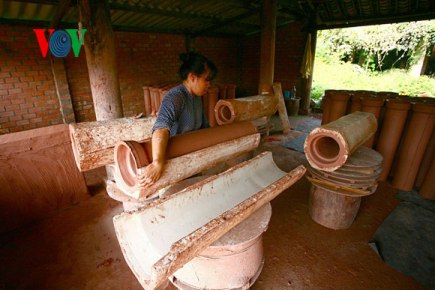 | Nguyen Thi Thanh Tam, die sich seit 15 Jahren mit der Herstellung von Keramikprodukten beschäftigt, schneidet gerade Ton, um ein Leitungsstück zu machen. |