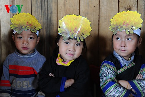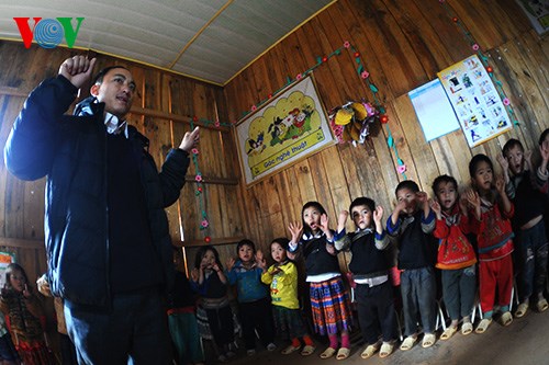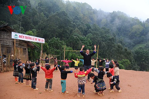 | 4. Es gibt 29 Kinder in der Gruppe von Giang, die alle zur Mong-Minderheit gehören. Die Lehr- und Lernmittel im Kindergarten Lao Chai sind sehr beschränkt. Aber Erzieher Giang und seine Kollegen überwinden täglich Schwierigkeiten, um die Kinder gut zu betreuen und ihnen viel beizubringen. |