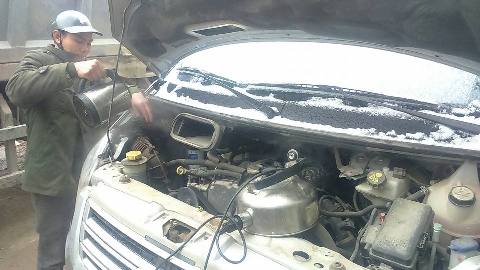 | Ein Mann nutzt heißes Wasser, um das Auto wieder zu starten. |