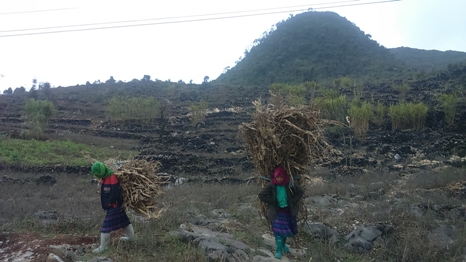 | Die Einwohner holen Gräser, um Futter für die Rinder herzustellen. |