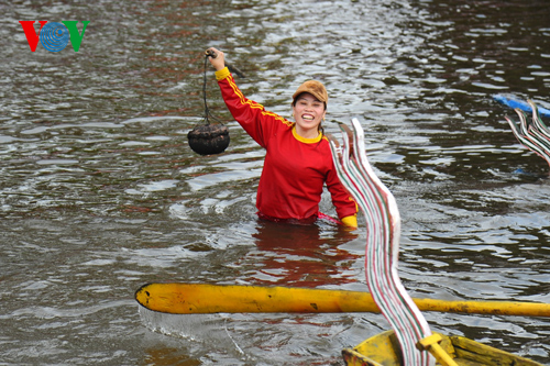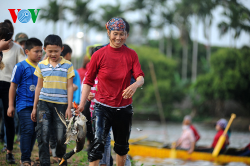 | Frauen der Gemeinde Thanh Xa zögern nicht und springen ins Wasser, um eine Ente zu fangen. |