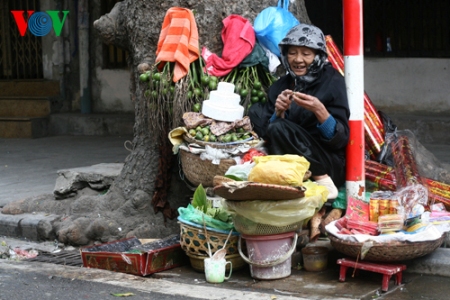 | Die Straßenverkäuferin bietet Pagodenbesuchern typische Dinge für das Tet-Fest wie beispielsweise Betelnüsse und Räucherstäbchen. |