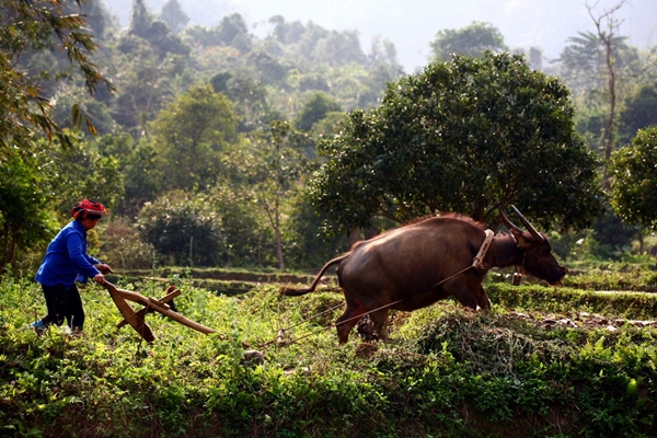 | Ein Mann der Volksgruppe der Mong bebaut ein Feld auf einem Abhang in der Gemeinde Sung Trai. |
