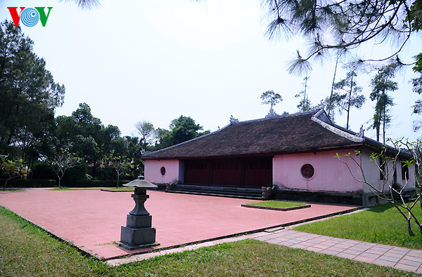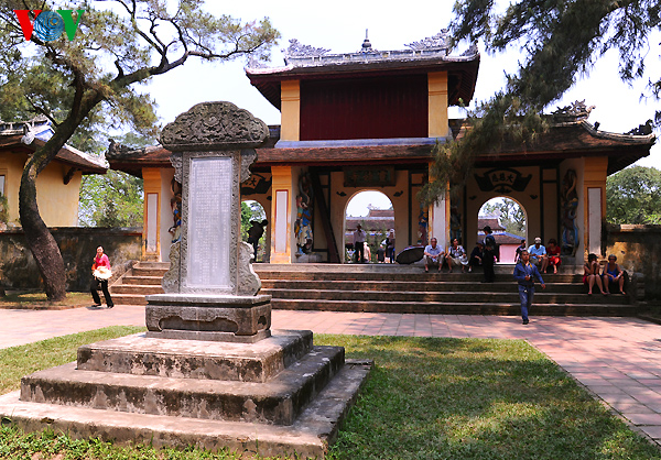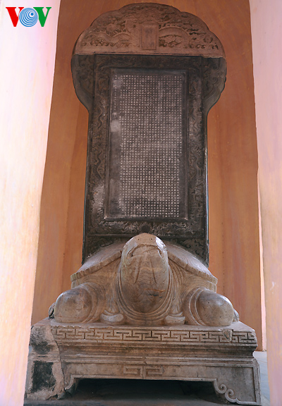 | Auf dem Gelände der Pagode gibt es außerdem eine Steinstele aus der Zeit des Fürsten Nguyen Phuc Chu. Die Stele ist 2,6 Meter hoch, 1,25 Meter breit und wurde auf einer Schildkröte aus Marmor aufgestellt. Die Schildkröte allein ist 2,2 Meter lang und 1,6 Meter breit. Auf der Stele wurde ein Bericht über den Bau der dortigen Einrichtungen graviert. |