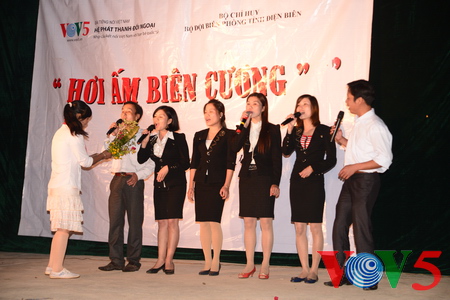 | Am Abend macht die Delegation von VOV5 gemeinsam mit den Lehrerinnen und Lehrern der Gemeinde Sen Thuong und den Grenzsoldaten ein Musikprogramm. |