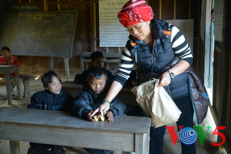 | Reporterin Lan Anh verteilt Süßigkeiten an die Kinder in der Schule Ta Lo San. |
