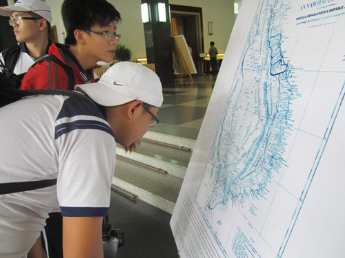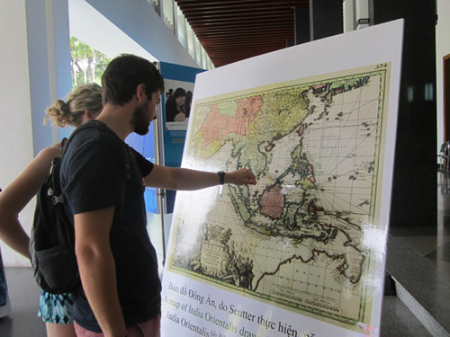 | Ausländische Besucher schauen eine alte Landkarte auf der Ausstellung. (Foto: thanhnien.com.vn) |