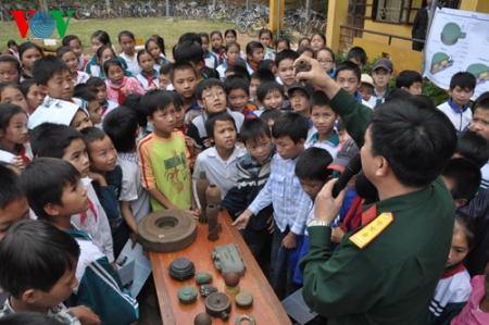 Hauptmann Nguyen Hong Son aus dem Zentrum über Technologien zur Minenräumung betonte die Bedeutung dieses Unterrichts, denn Unfälle mit Minen würden meistens aus dem nicht ausreichenden Bewusstsein stammen. Wenn Kinder die Splitterbomben und Granaten mit bunten Farben und interessanten Formen sehen, betrachten sie sie als Spielzeuge. Sie werden zu Minenopfern, wenn die Minen explodieren. Dazu Hauptmann Nguyen Hong Son: