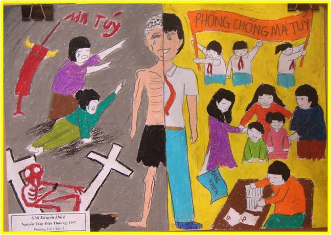 | Bilder mit dem Thema "gegen Drogen in Schulen", die von vietnamesischen Schülern gemalt wurden. |