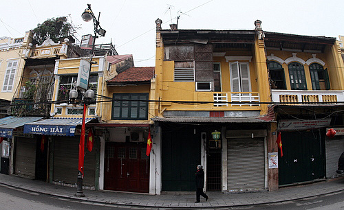 | Ruhige Straße in der Altstadt Hanoi am ersten Tag des Neujahrsfestes Tet. |