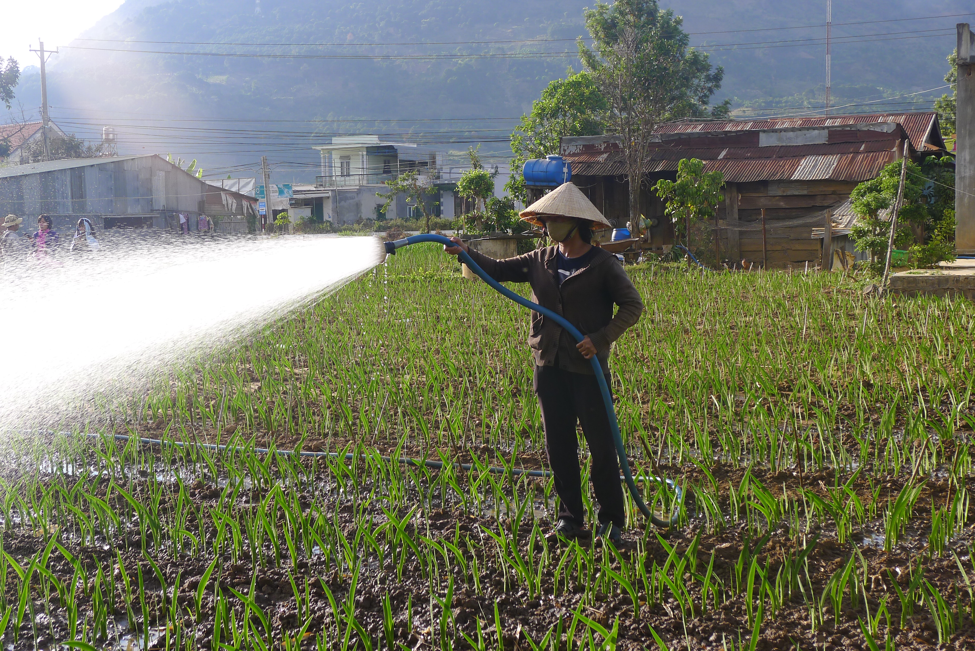 | Eine Bewohnerin in Hiep An gießt Gladiolen. |