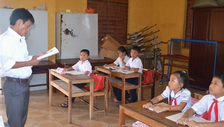 Dies ist das dritte Schuljahr, dass junge Lehrer Le Anh Duc mit der Grundschule “Insel Sinh Ton” verbunden ist. Lehrer Duc betrachtet die Schüler auf der Insel wie enge Familiemitglieder. Er sagt: