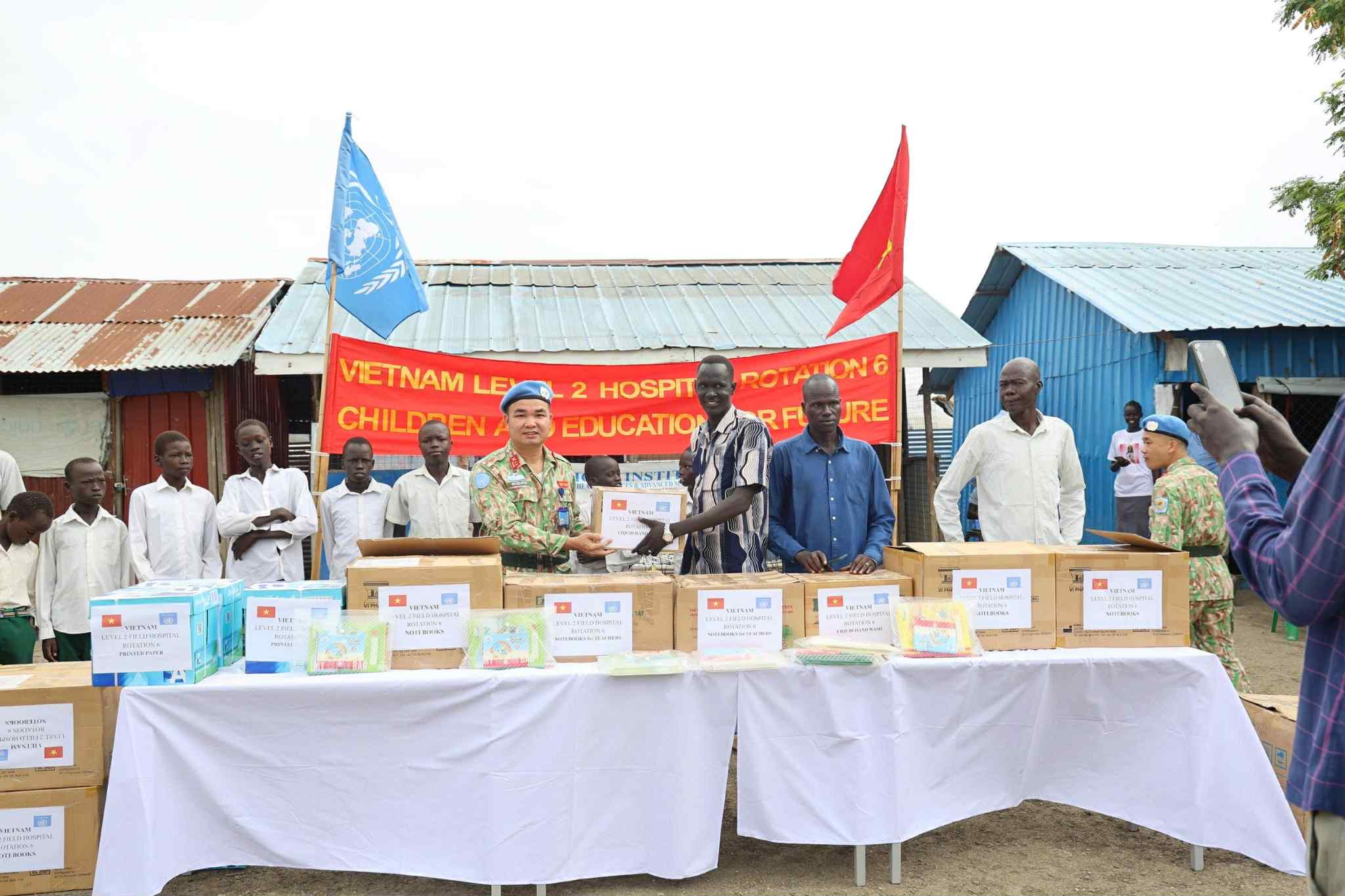 Die Soldaten und Mitarbeiter im Lazarett Nr. 6 Vietnams in der UN-Friedensmission im Südsudan haben den Kindern dort zum internationalen Kindertag am 1. Juni Schulsachen übergeben.