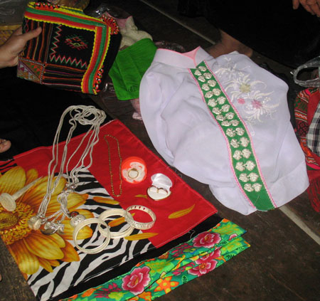 Dann teilt die Familie des Mädchens der Familie des Jungen mit, dass sie mit einer Hochzeit einverstanden ist. Die Familie des Jungen wählt einen guten Tag aus und schickt dann Vermittler und einige Vertreter zur Familie des Mädchens. Sie bringen Gaben mit. Dies sind 20 Kilogramm Schwein und ein Paar Hähne und Hennen als Opfergaben an die Vorfahren sowie 10 Liter Reisschnaps und 10 Kilogramm Klebreis, damit die Familie des Mädchens Essen vorbereitet um die Verwandten zum Essen einzuladen. Beide Seiten diskutieren und wählen einen guten Tag für die Hochzeit aus.