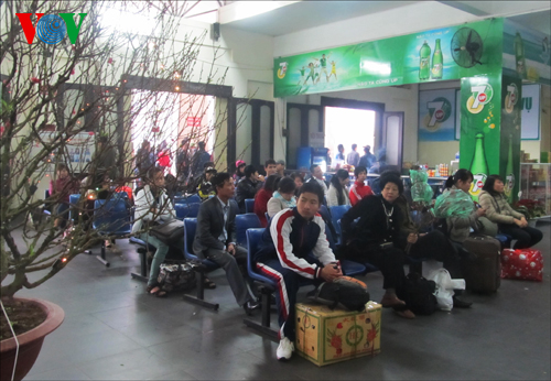 Auf Bahnhöfen und Busbahnhöfen ist es immer noch voll von Menschen. Viele Menschen arbeiten weitweg von ihrer Heimat und warten auf das letzte Bus, um schnell nach Hause zu fahren. In ihren Händen oder auf den Schultern tragen sie Geschenke, kleine Pfirsichzweig oder einen kleinen Blumentopf für die Familie zum Neujahrsfest Tet. Studentin Nguyen Bich Thuy musste in den vergangenen Tagen einen Nebenjob machen und kann erst heute in die Heimat fahren.