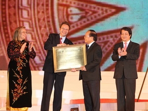 | UNESCO-Vertreter überreicht die Urkunde der Verehrung der Hung-Könige als immaterielles Kulturerbe der Menschheit an Vertreter Vietnams. (Foto: Nguyen Khang/VNA) |