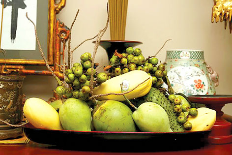 Auf dem Hausaltar gibt ein Tablett mit fünf verschiedenen Obstsorten. Das Tablett mit Obst symbolisiert Glück und Wohlstand. Speisen als Opfergaben zeigen nicht nur die Verehrung der Vorfahren, sondern auch die Kunstfertigkeit der Frauen im Süden. Der Einwohner in der südvietnamesischen Provinz Dong Nai, Pham Van Hung stellen Speisen als Opfergaben auf den Altar der südvietnamesischen Einwohner:
