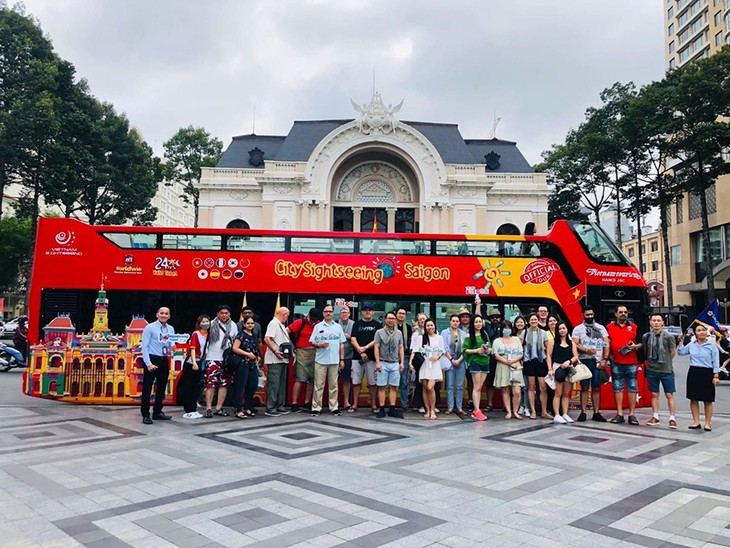 Bei der Fahrt mit dem Doppeldeckerbus besuchten ausländische Touristen das Theater von Ho Chi Minh Stadt. (Foto: Hoang Tuyet/baotintuc.vn)