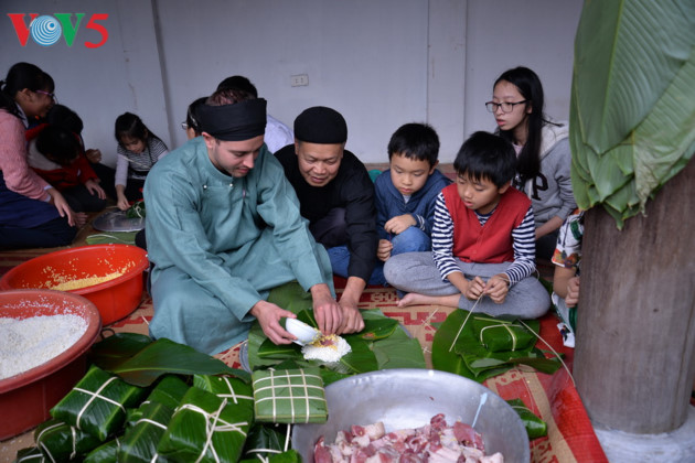 In einem Ao Dai wickelt der Amerikaner Erik einen Chung-Kuchen.