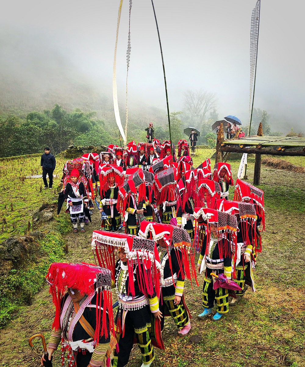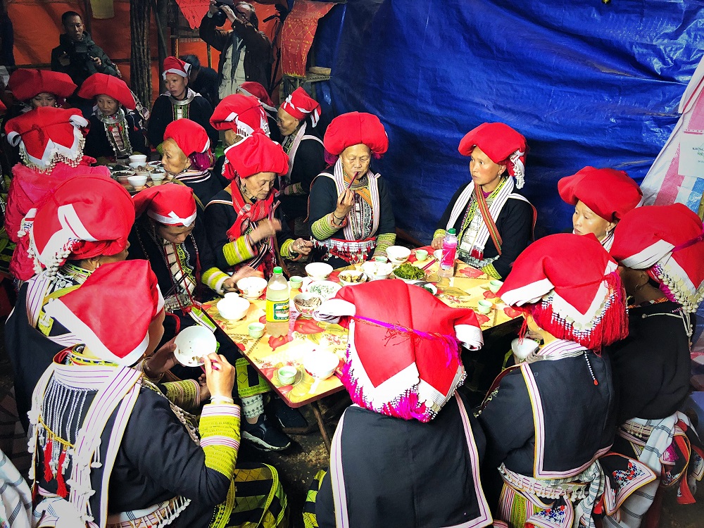 Die traditionellen Kostüme der Dao-Frauen bei dem Ritual.