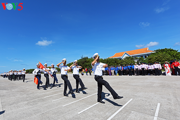 Am hochsommerlichen und windigen Tag auf der Insel Truong Sa wurden zehn Lektionen als Versprechen der vietnamesischen Armee laut und kräftig gesprochen, um die Entschlossenheit zur Verteidigung der Souveränität des Landes zu demonstrieren. Die Soldaten und die Teilnehmer singen anschließend die Nationalhymne. |