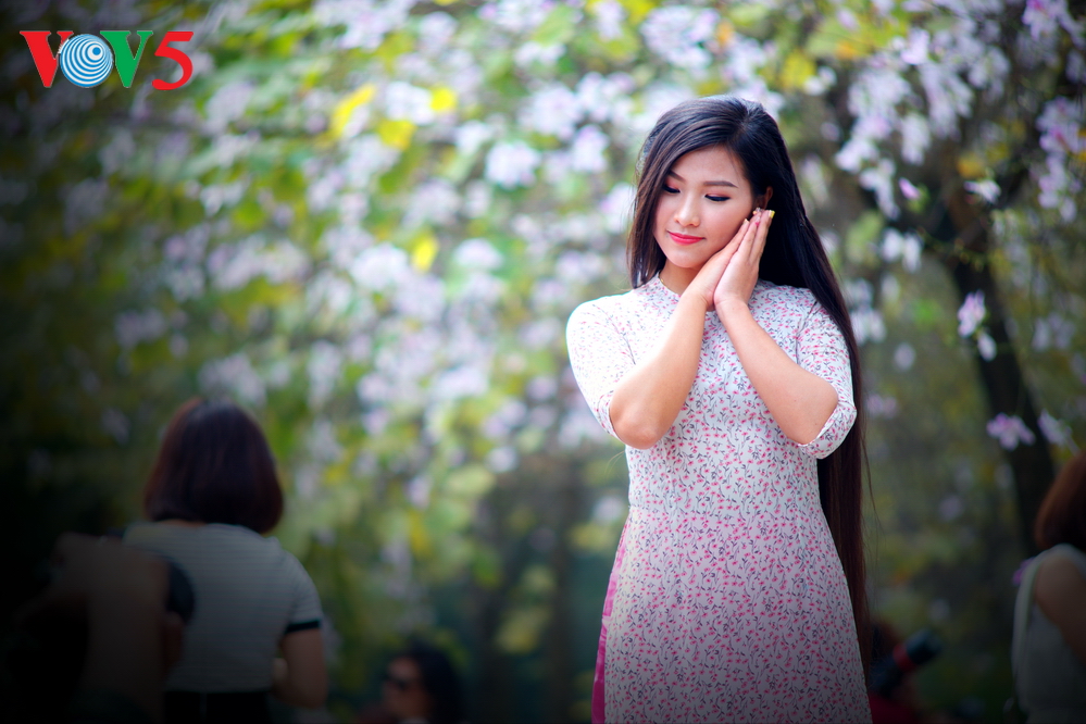 | Am Wochenende wirkt die Straße Hoang Dieu zusammen mit der farbenfröhlichen Tracht der Ao Dai der Frauen sehr lebhaft, wenn sie unter den Bauhinien Fotos zusammen machen.10 Außer Bac Son und Hoang Dieu sind Bauhinien am West-See, um das Denkmal von Lenin herum und in der Straße Nguyen Du angepflanzt. |