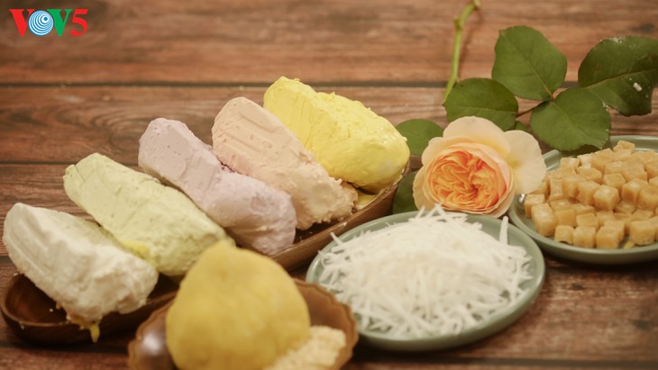 | Zutaten für Troi-Kuchen sind Klebreismehl, Zucker, Kokosnussraspeln. |