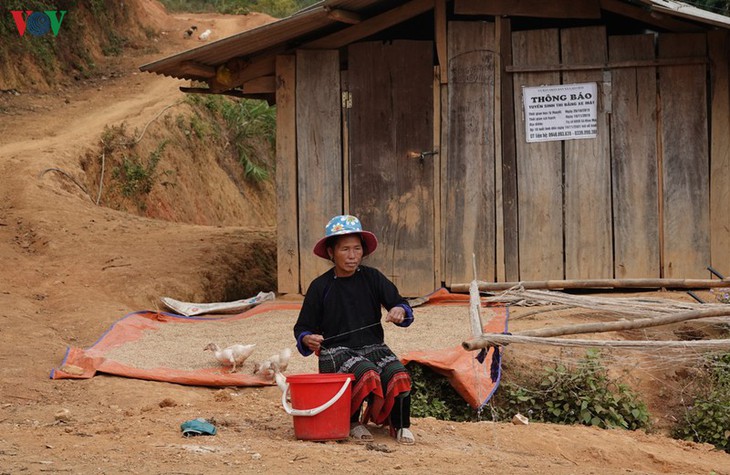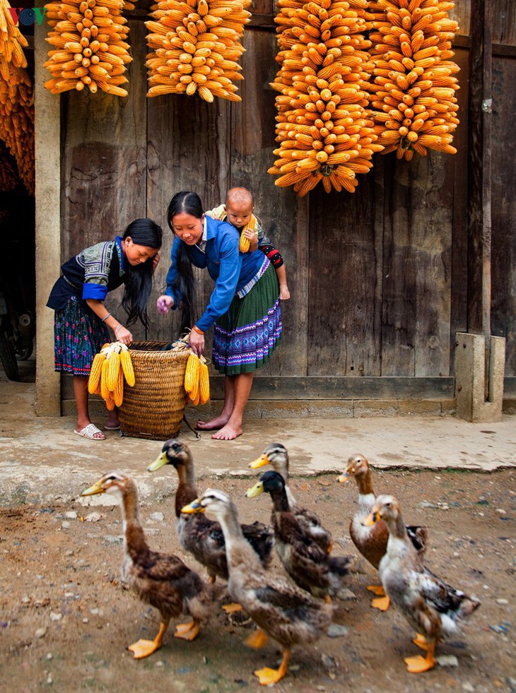 | Die Frauen der Volksgruppe der Mong arbeiten und plaudern nach der Erntezeit. |