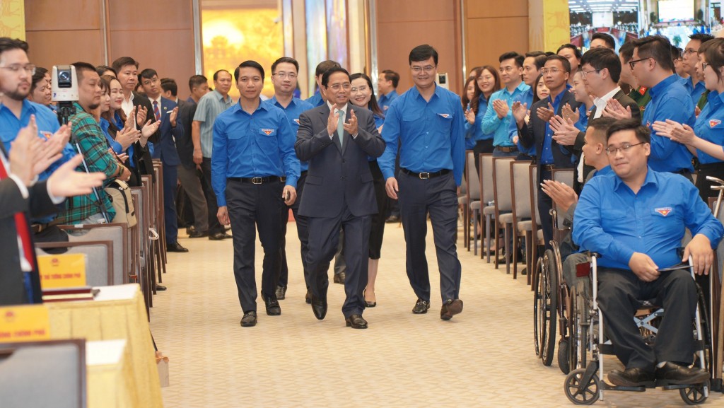 Premierminister Pham Minh Chinh (M.) beim Treffen mit Jugendlichen. (Foto: tuoitrethudo.com.vn) |