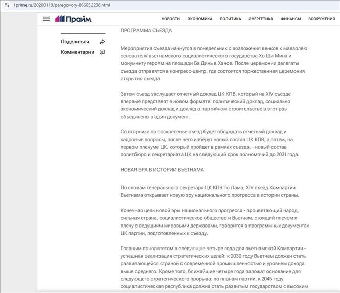 Das russische Finanz- und Wirtschaftsportal berichtet über den 14. Parteitag der KPV. (Foto: Tran Hai/VNA) |