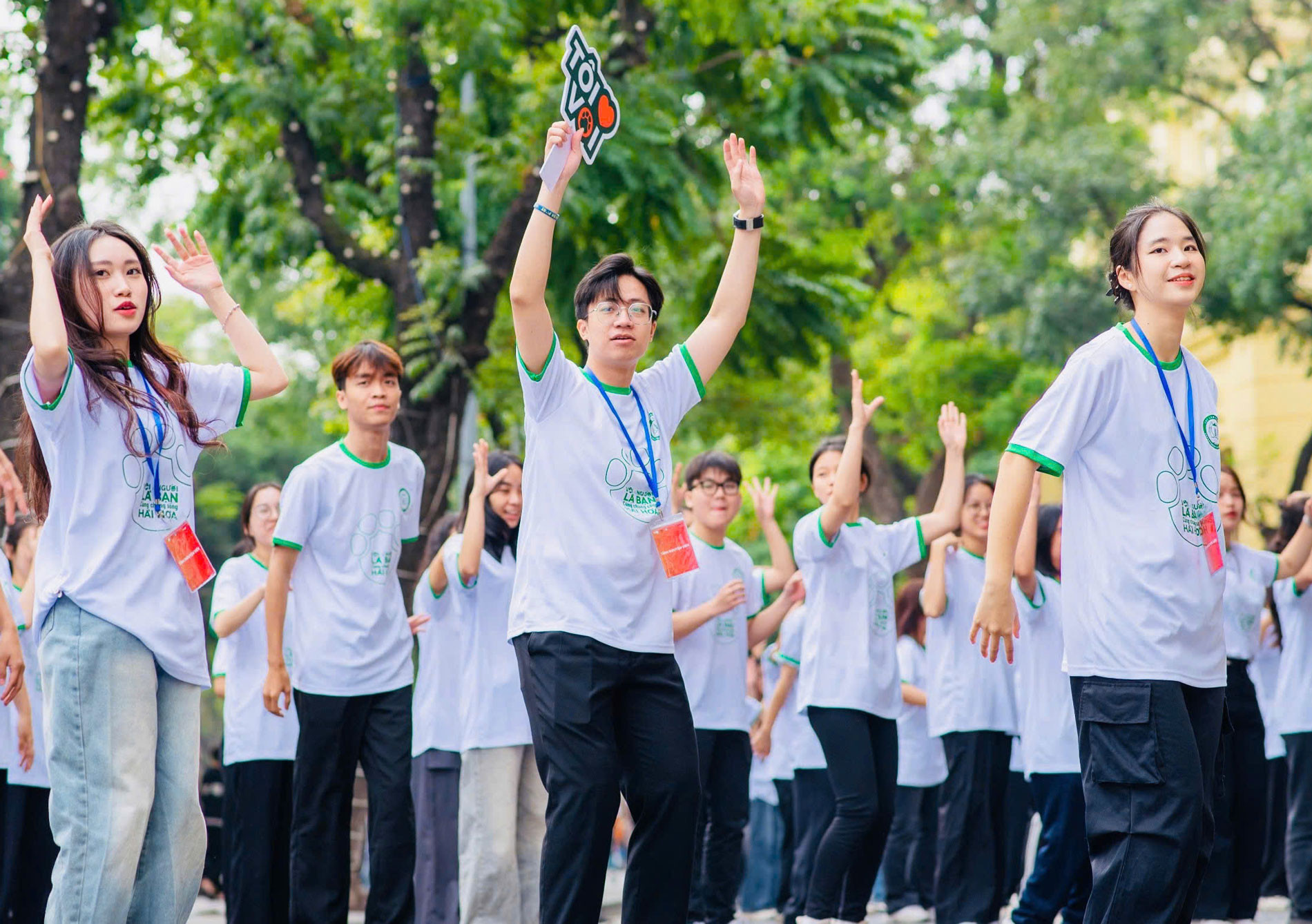 Zahlreiche Jugendliche nehmen am Flashmob-Tanz mit Botschaft über Wald- und Wildtierschutz teil. (Foto: VOV) |