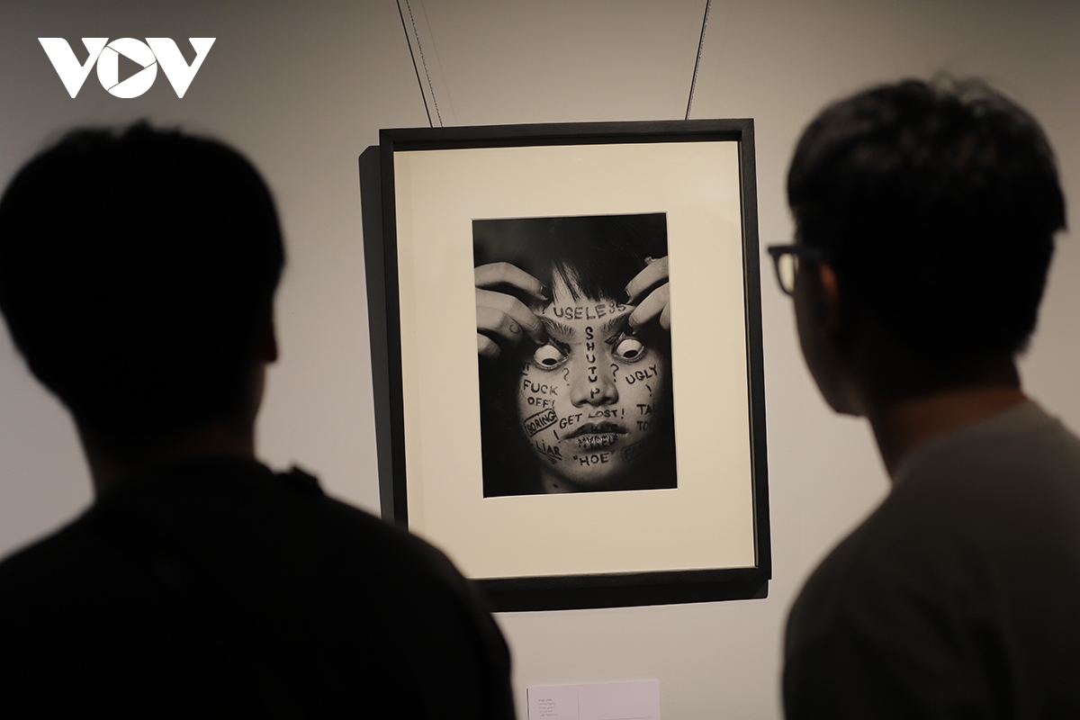 Besucher interessieren sich für ein Schwarzweißfoto bei der Ausstellung. (Foto: VOV) |