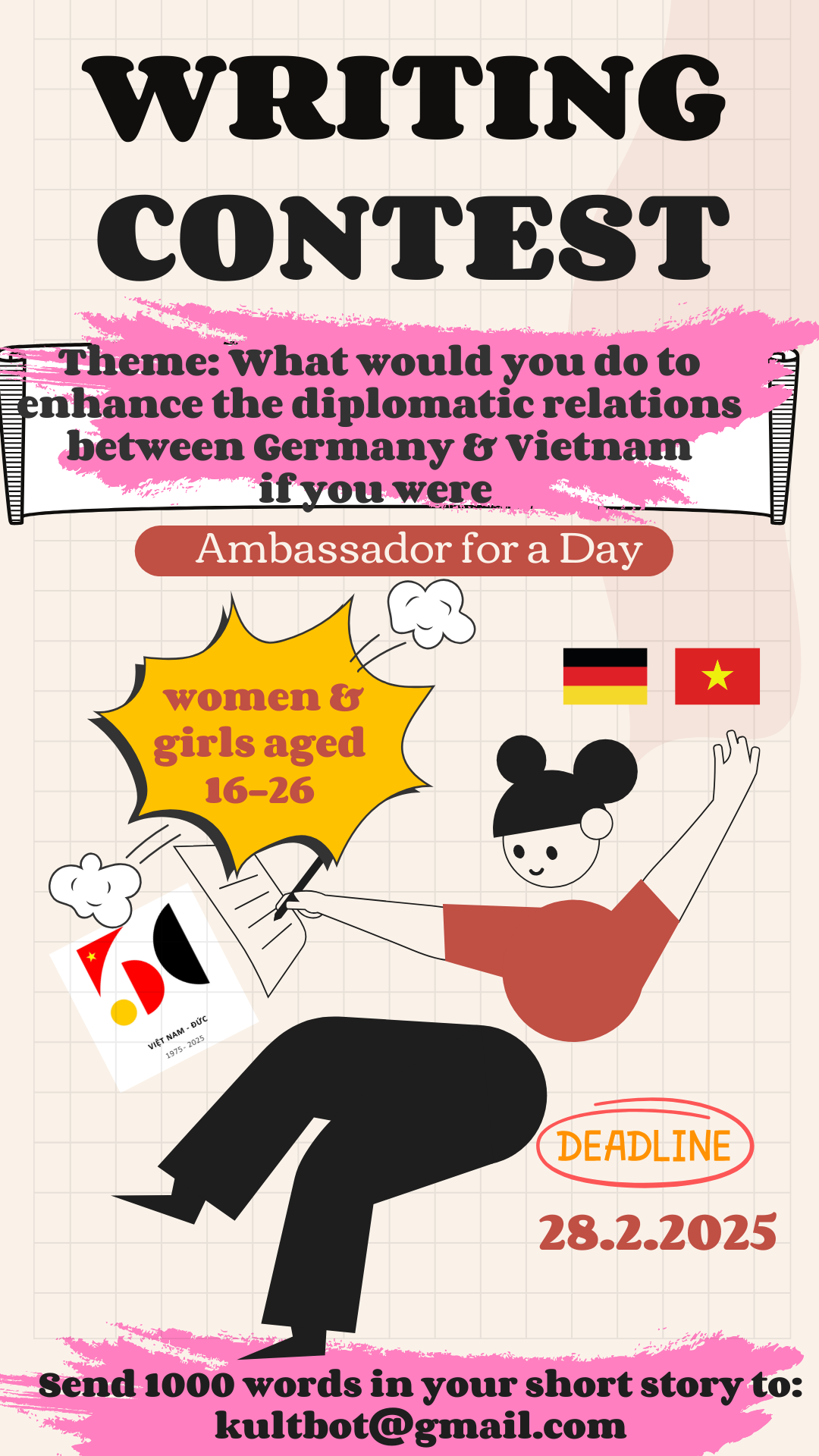 Beim Wettbewerb können sich vietnamesische Schülerinnen und Studentinnen zwischen 16 und 26 Jahren mit einem Beitrag zu den zwei folgenden vorgeschlagenen Themen bewerben: „Wie pflegt man die Beziehungen zwischen Deutschland und Vietnam?“ und „Wenn Sie Botschafterin für einen Tag wären, was würden Sie tun, um die diplomatischen Beziehungen zwischen Deutschland und Vietnam zu verstärken?“.