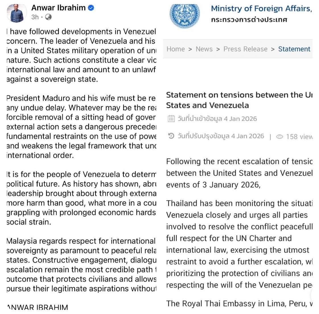 Ebenfalls am Sonntag veröffentlichte das thailändische Außenministerium eine Erklärung, in der es die USA, Venezuela und alle relevanten Parteien aufrief, sich zurückzuhalten, eine Eskalation des Konflikts zu vermeiden, dem Schutz der Zivilbevölkerung Priorität einzuräumen und den Willen des venezolanischen Volkes zu respektieren.