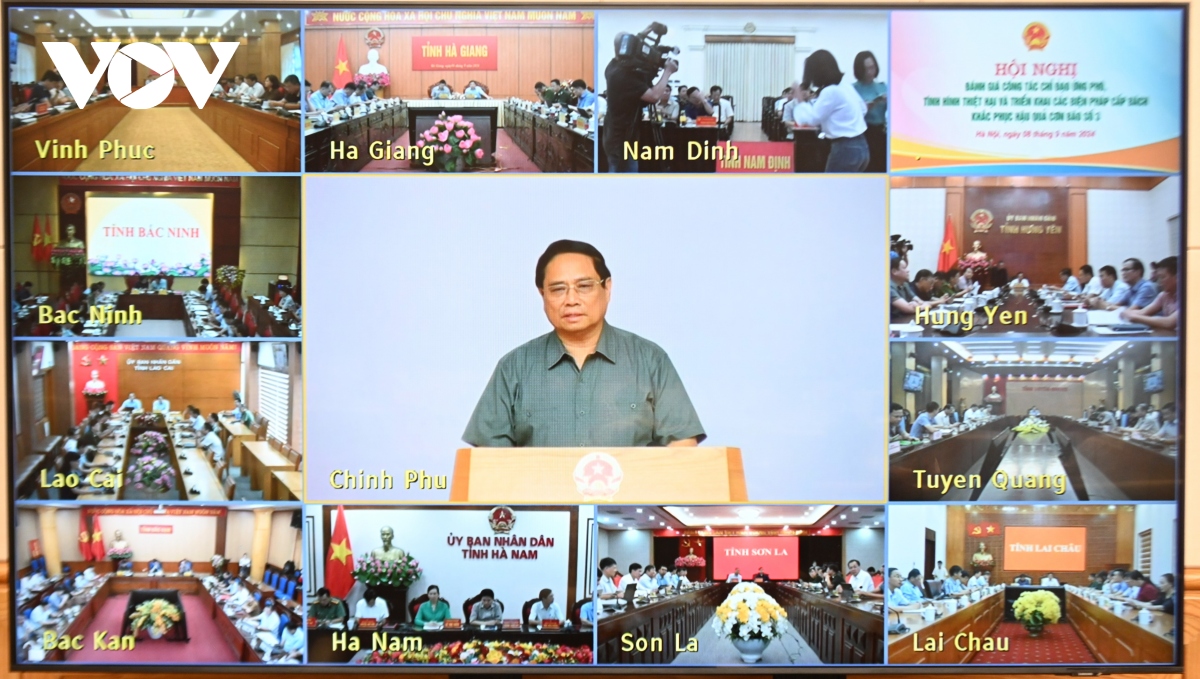 Premierminister Pham Minh Chinh leitet die Video-Konferenz mit den vom Taifun betroffenen Provinzen. |
